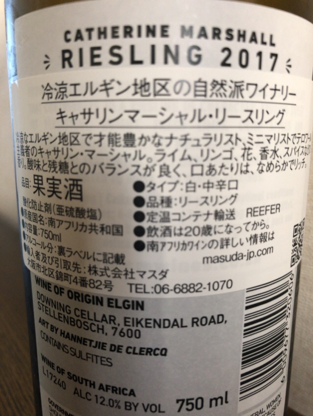 テロワール主義者と言われる造り手が南アフリカのエルギンで生み出した「キャサリン・マーシャル・リースリング」を飲みました。